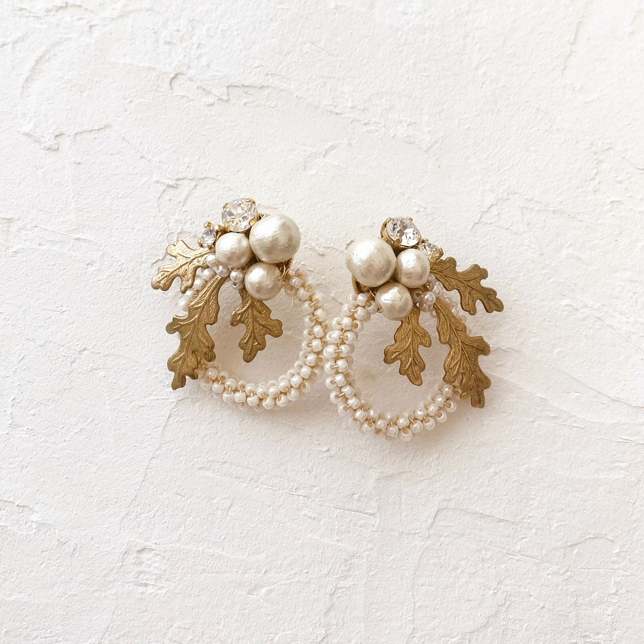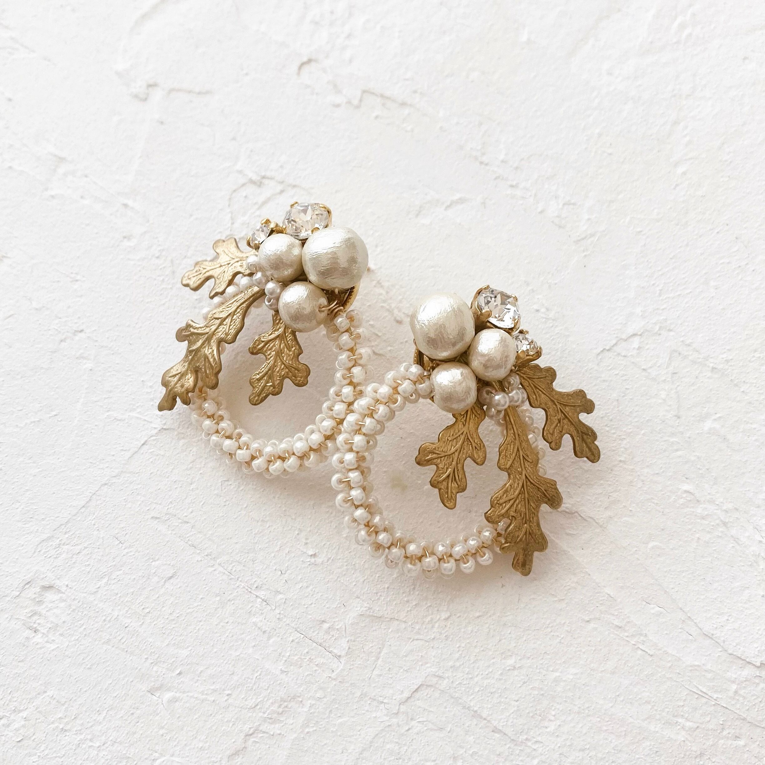 インポートの葉の真鍮(ブラス)パーツ、コットンパールやビジュー、ガラスビーズなど多種類のパーツを使用した、華やかで存在感のあるデザインです。