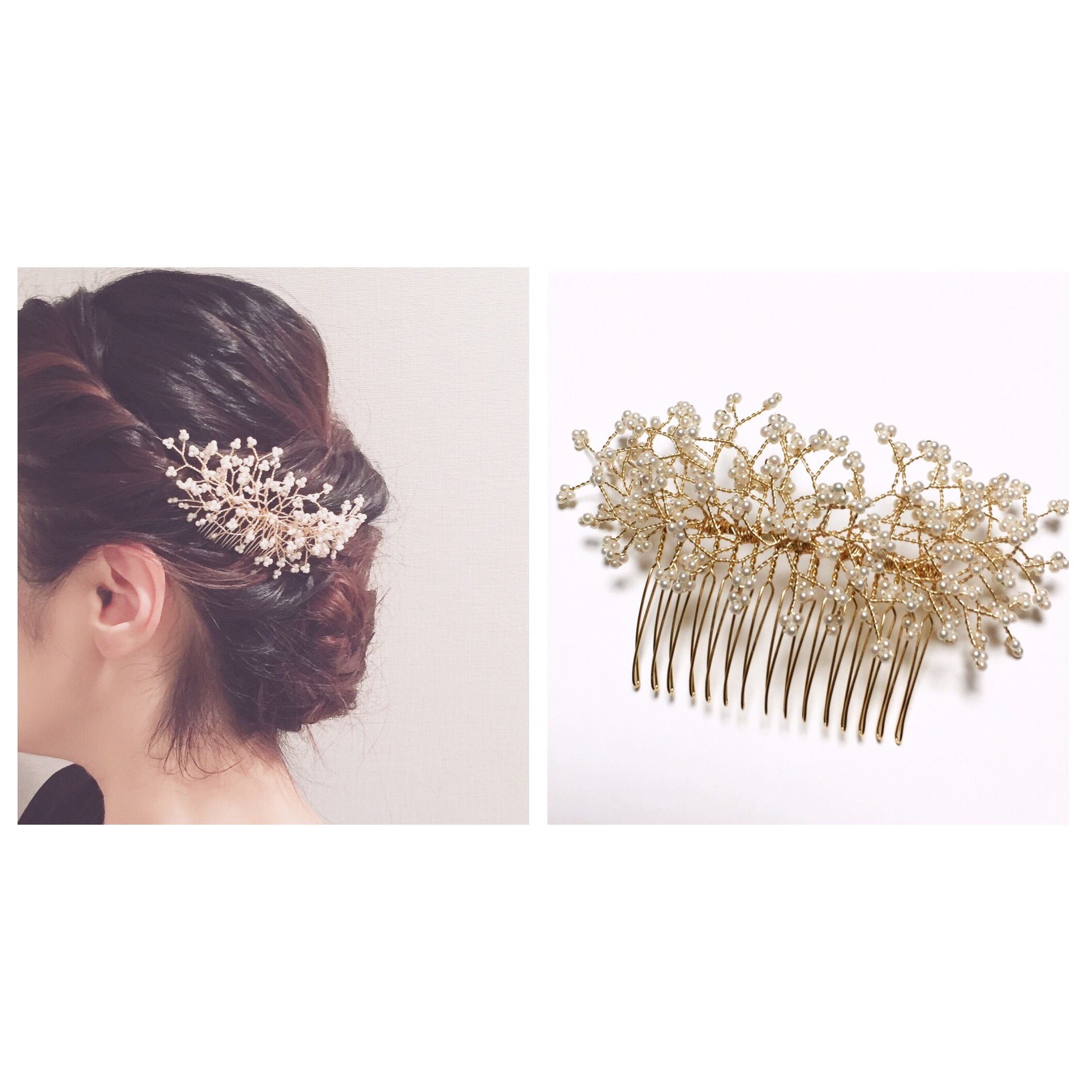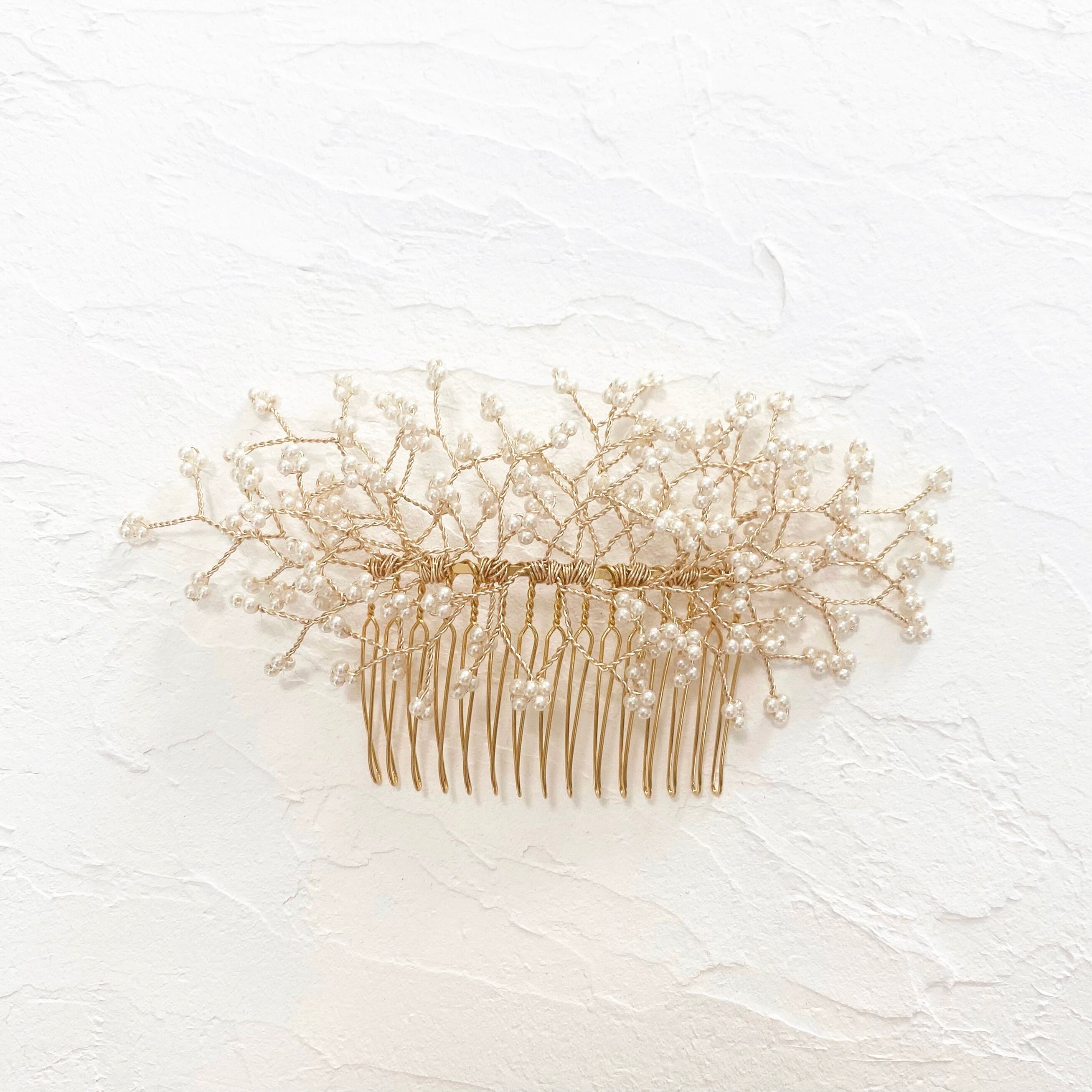 オフホワイトのパールを一つ一つ丁寧に編み上げ、コームに巻き付けています。