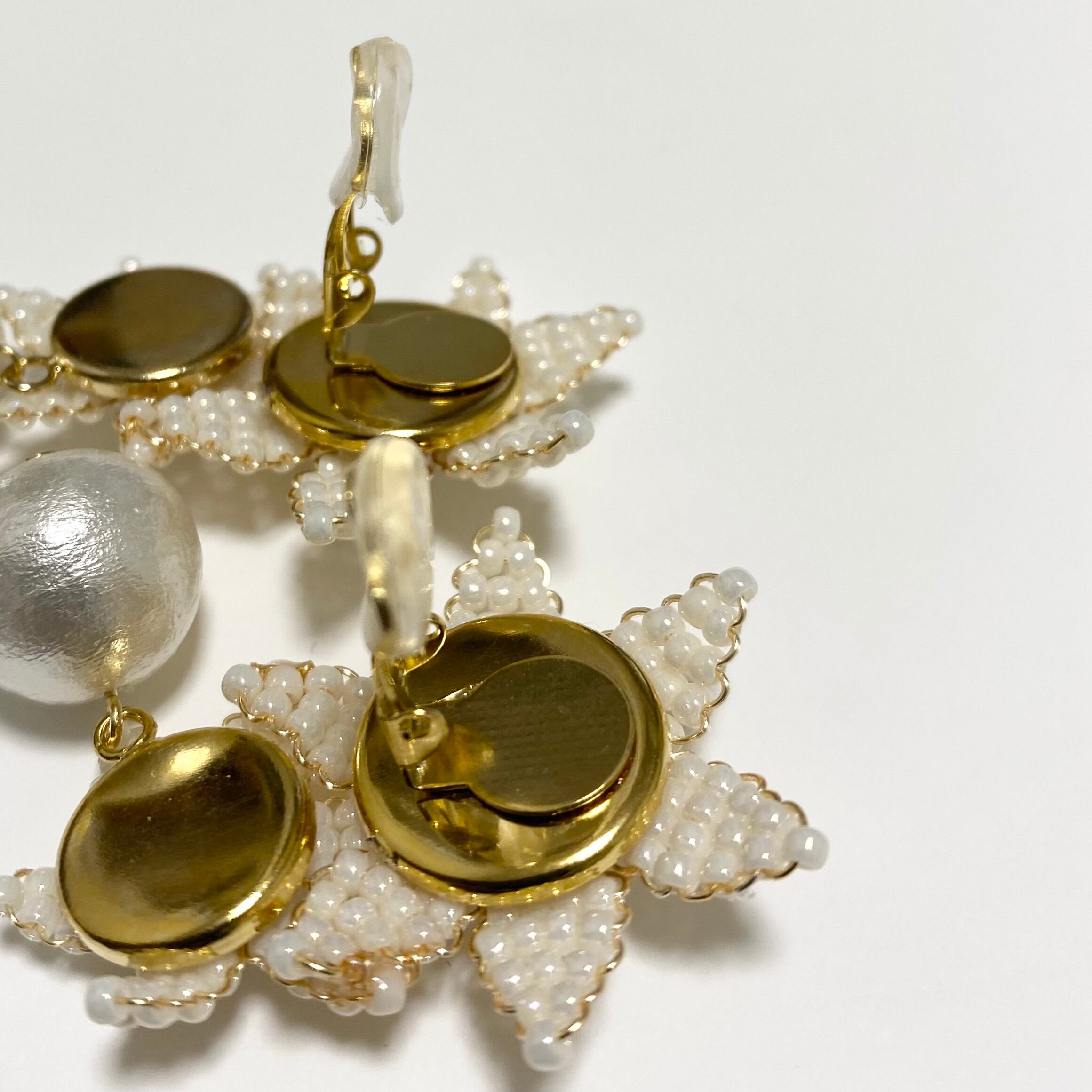 お花が縦に2つ、下の大きなコットンパールは、軽く揺れるデザインです。