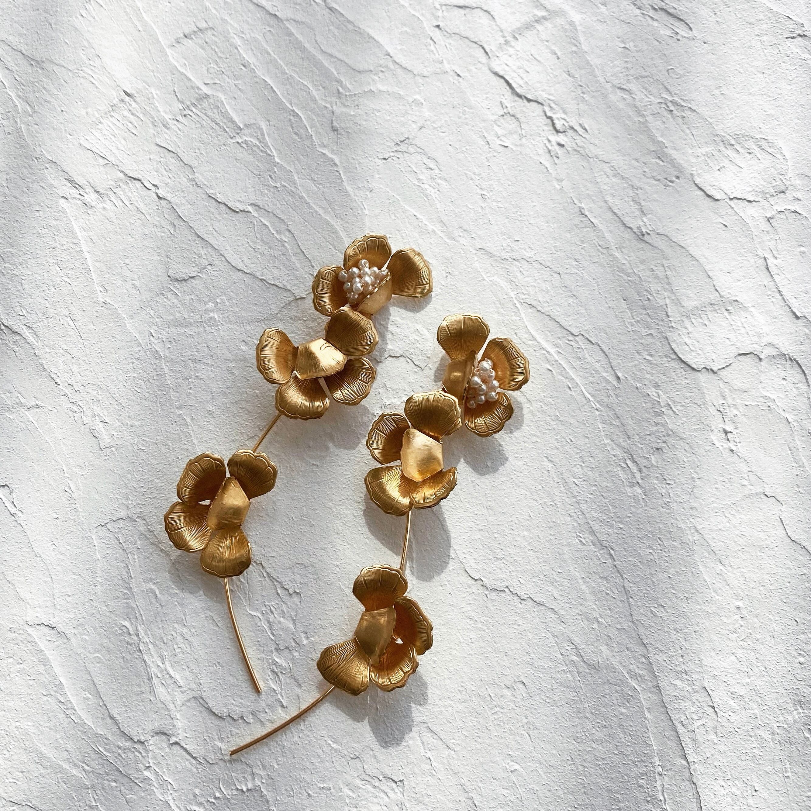 3つのお花のパーツが縦に並び、花弁の間から小さなパールが溢れていて華やかなデザインです。