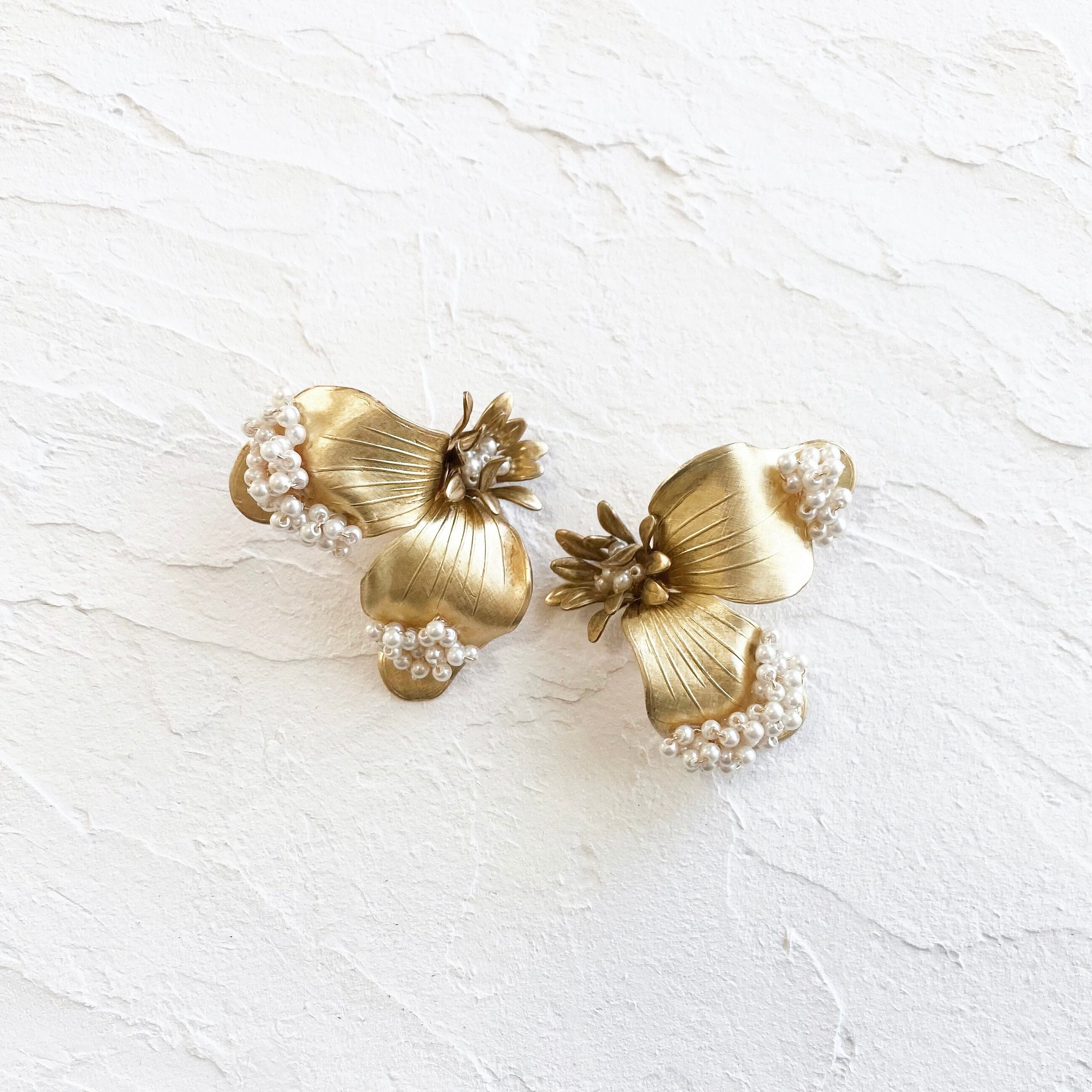 立体感のある大きな花びらのパーツに小さなパールを散りばめたデザイン。